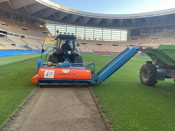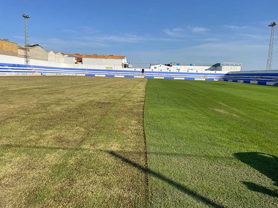Regeneración de Campo de fútbol “Pista de Atletismo” de Ceuta mediante siembra de semilla BERMUDA, con una superficie aproximada de 7.500 metros cuadrados. Para la renovación del terreno de juego se han realizado las operaciones de aireación, resiembra y recebo de arena, todas ellas llevadas a cabo por personal de la plantilla de TURF GREEN especializada en este tipo de funciones y con maquinaria de nuestro propio parque que fue trasladada al continente africano.