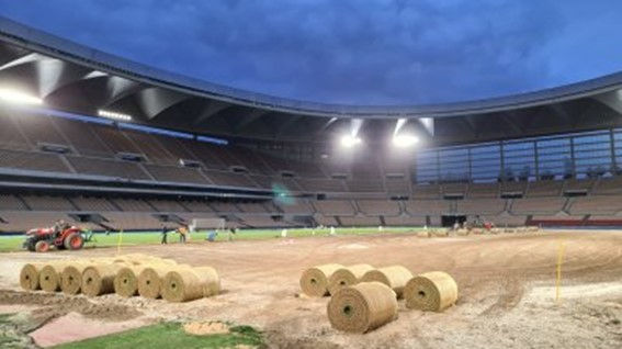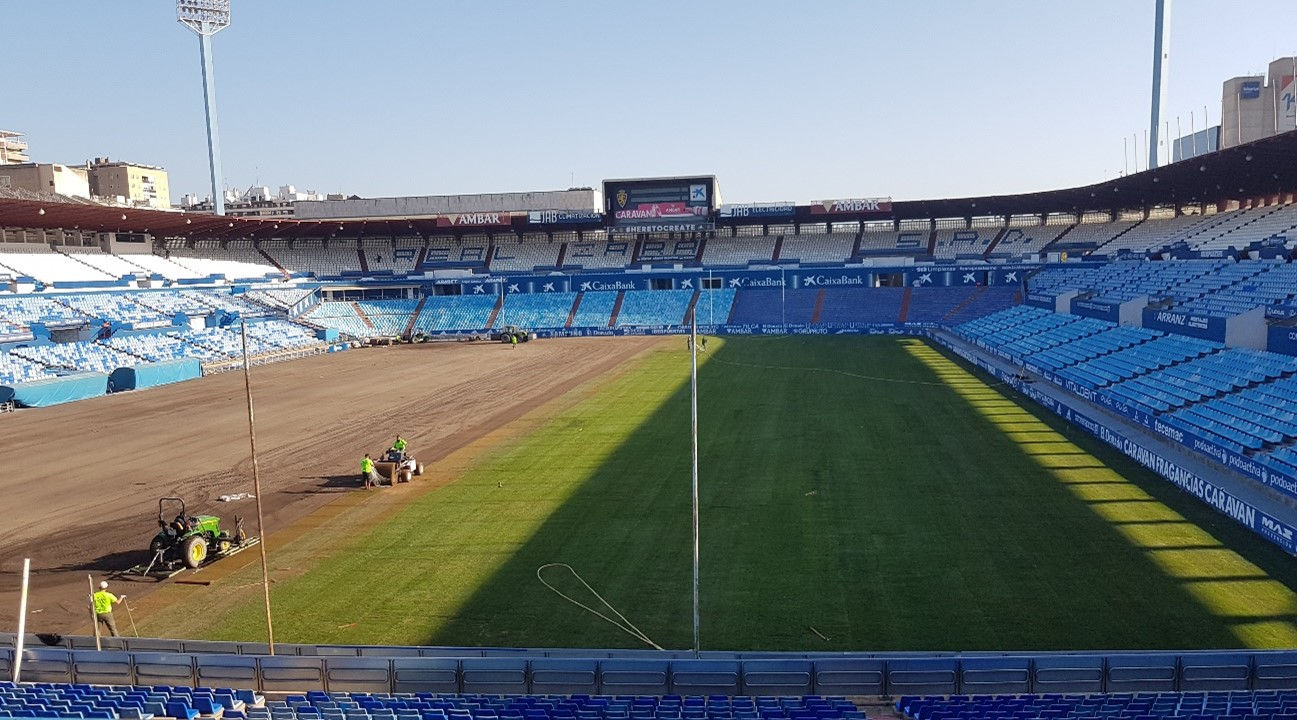 Renovación del terreno de juego del Estadio la Romareda donde disputa sus partidos el equipo de la ciudad maña, el Real Zaragoza, con una superficie superior a 9.000 metros cuadrados. El equipo de TURF GREEN desplazado a Zaragoza, ha llevado a cabo operaciones de movimiento de tierra e instalación de tepe de nuestra mezcla SPORT (Ray Grass Inglés y Poa pratensis) en formato BIG ROLL.