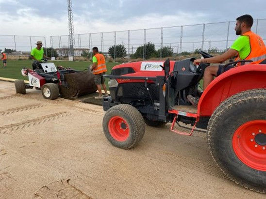 Renovación del terreno de juego del Campo de Entrenamiento del Atlético Baleares mediante la formación de la capa de enraizamiento para la posterior siembra de semillas de Ray Grass Inglés y Poa pratensis, incluyendo sistema de riego y drenaje al completo.